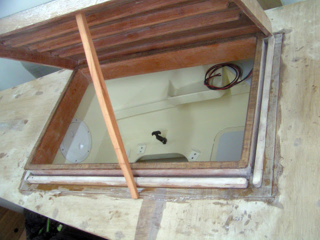 Coaming is a surface intended to deflect water. Double coamings are a proven method of producing water tight hatches without relying on a sealing material. The water must take an unlikely tortuous path in order to reach the vessel's insides. Above, the locker hatch is propped open over the head compartment. The compartment opening is surrounded by the taller inner coaming. A 1/4" lip extends outward from the inner coaming top to help deflect water from the inside. The hatch seats against the much lower outer coamings spaced outside the inner coaming's perimeter.