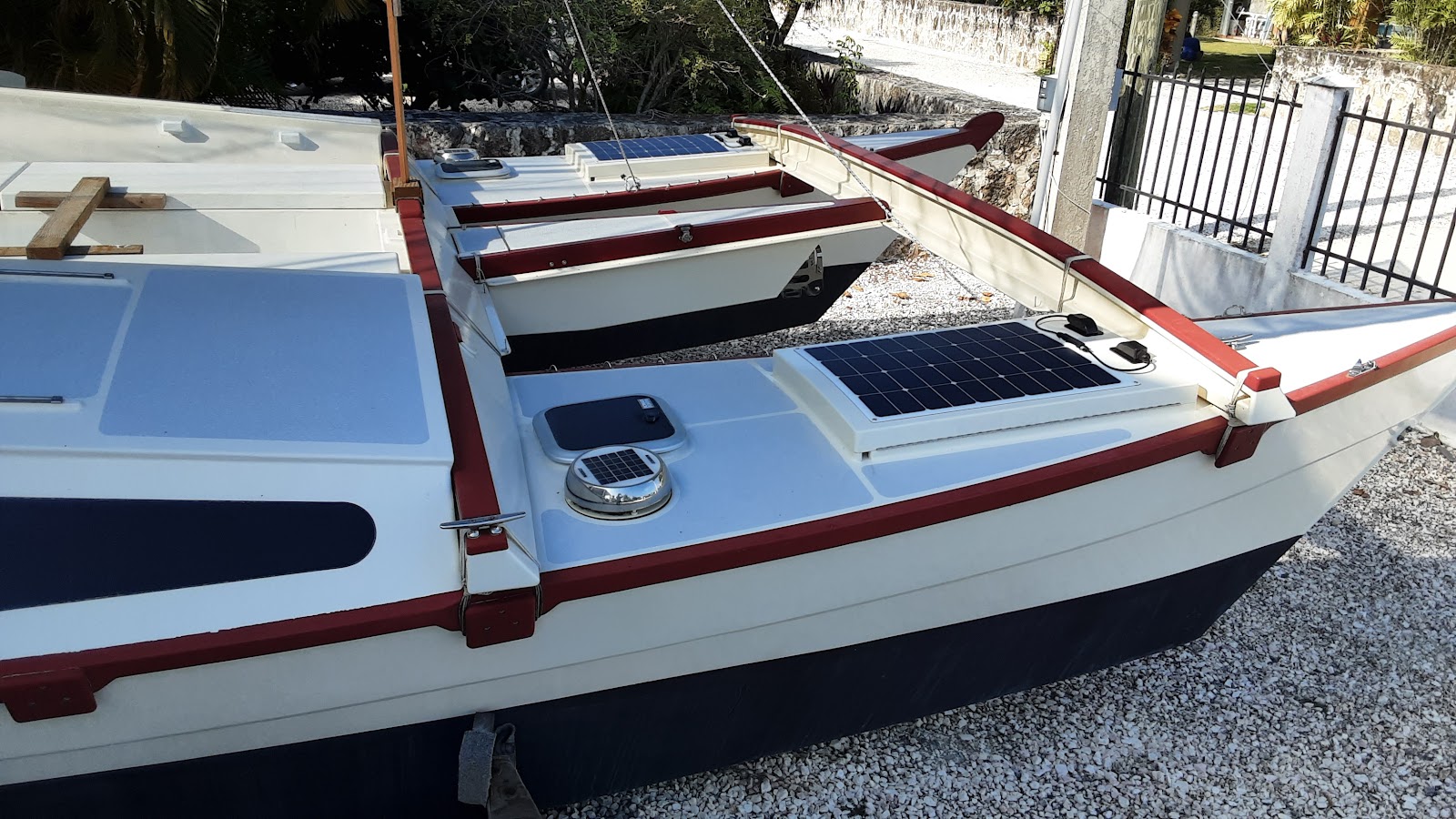 - Main sail with burgundy gaff sleeve, sail cover, sail number 449 and inverted Wharram logo (for those two readers who know the boat's name)